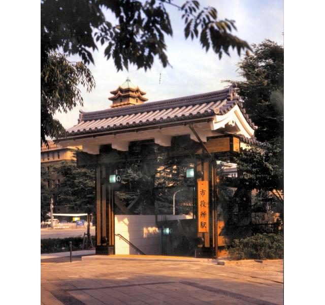 名古屋城の高麗門を模した市役所駅の7番出入口