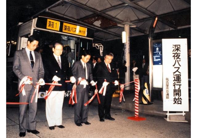 生活時間の変化などによるニーズの多様化に対応するために、市バスでは、平成2年12月、深夜バスを2系統(栄~藤が丘、栄~地下鉄高畑)新設しました。また、3年10月の市バスのダイヤ改正では、幹線系統の増加(6系統増加し全部で20系統)、昼間時間帯の運行回数の増回、終車時刻の繰り下げを行いました。